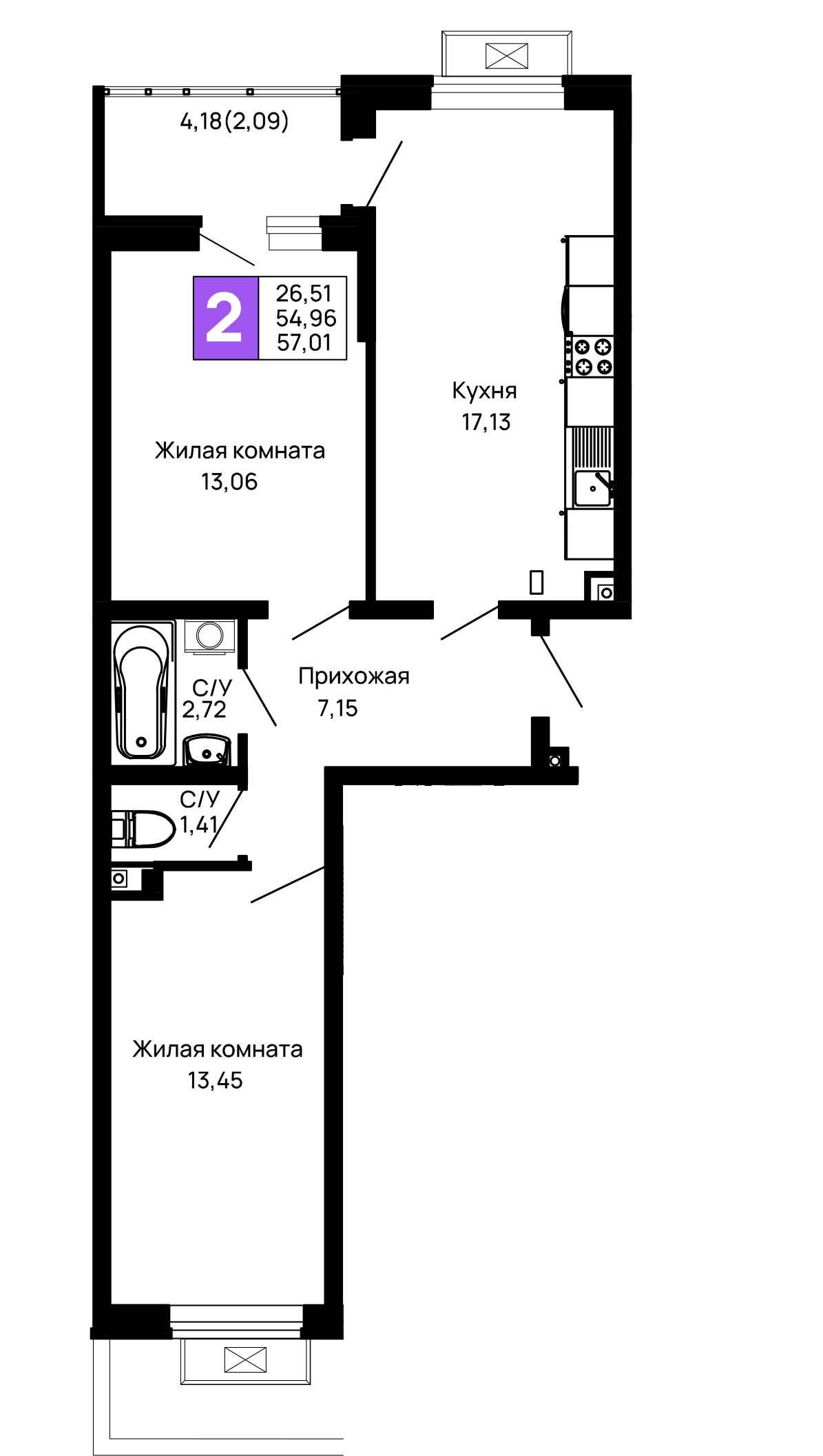 - Общая площадь: 57.01 м²