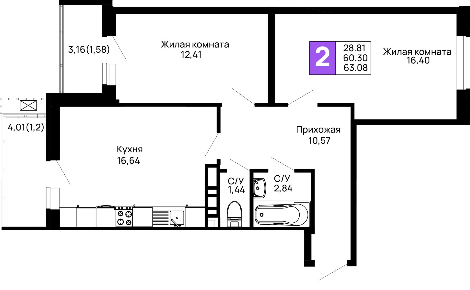 - Общая площадь: 63.08 м²