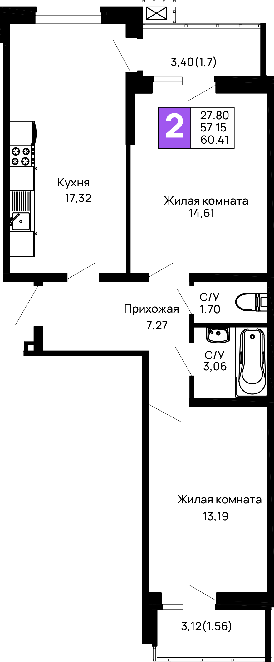 - Общая площадь: 60.41 м²