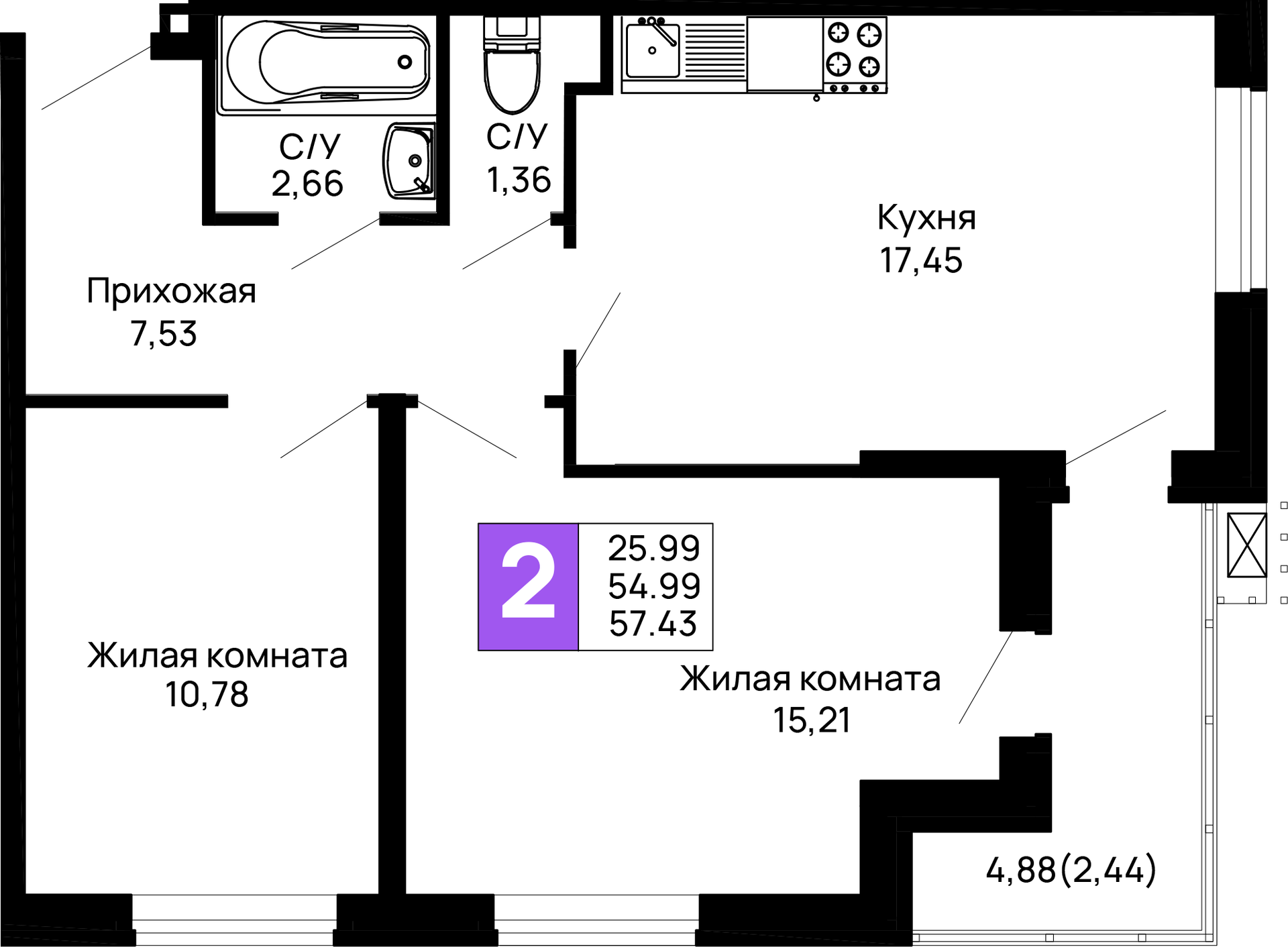 - Общая площадь: 57.43 м²