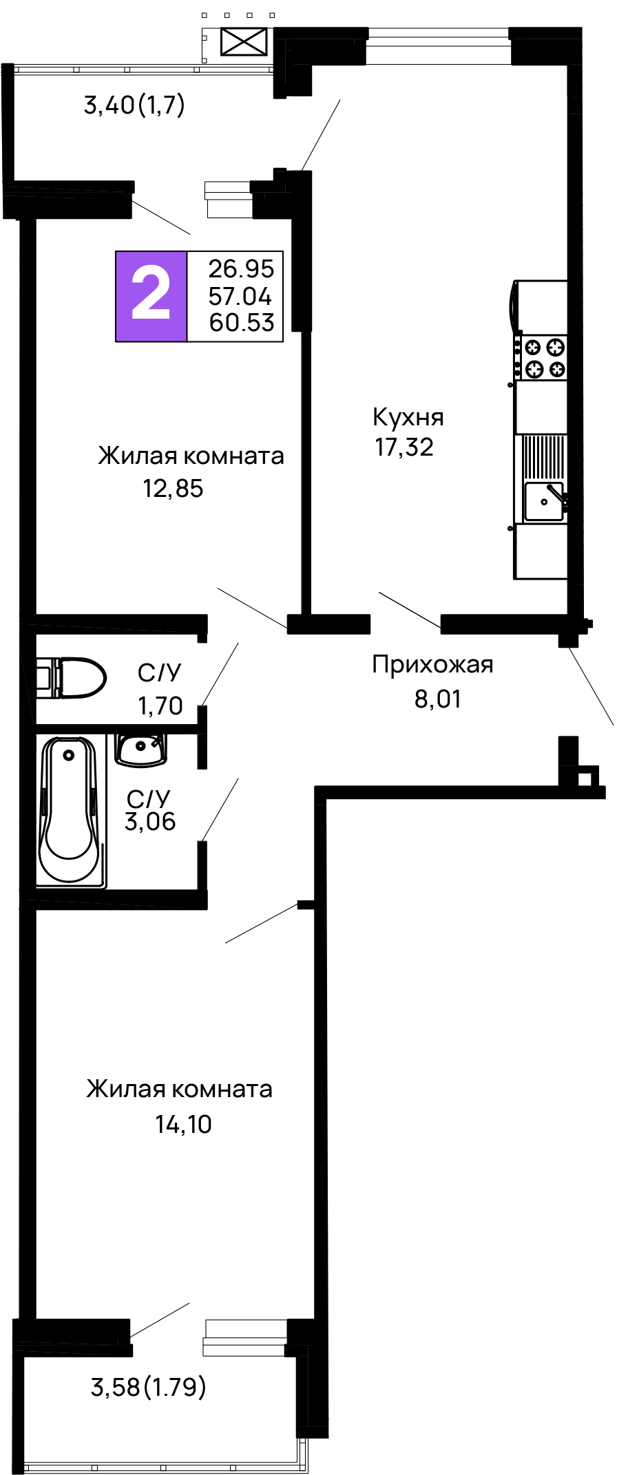 - ✅ Кухня: 17.32 м² — эргономичное пространство.