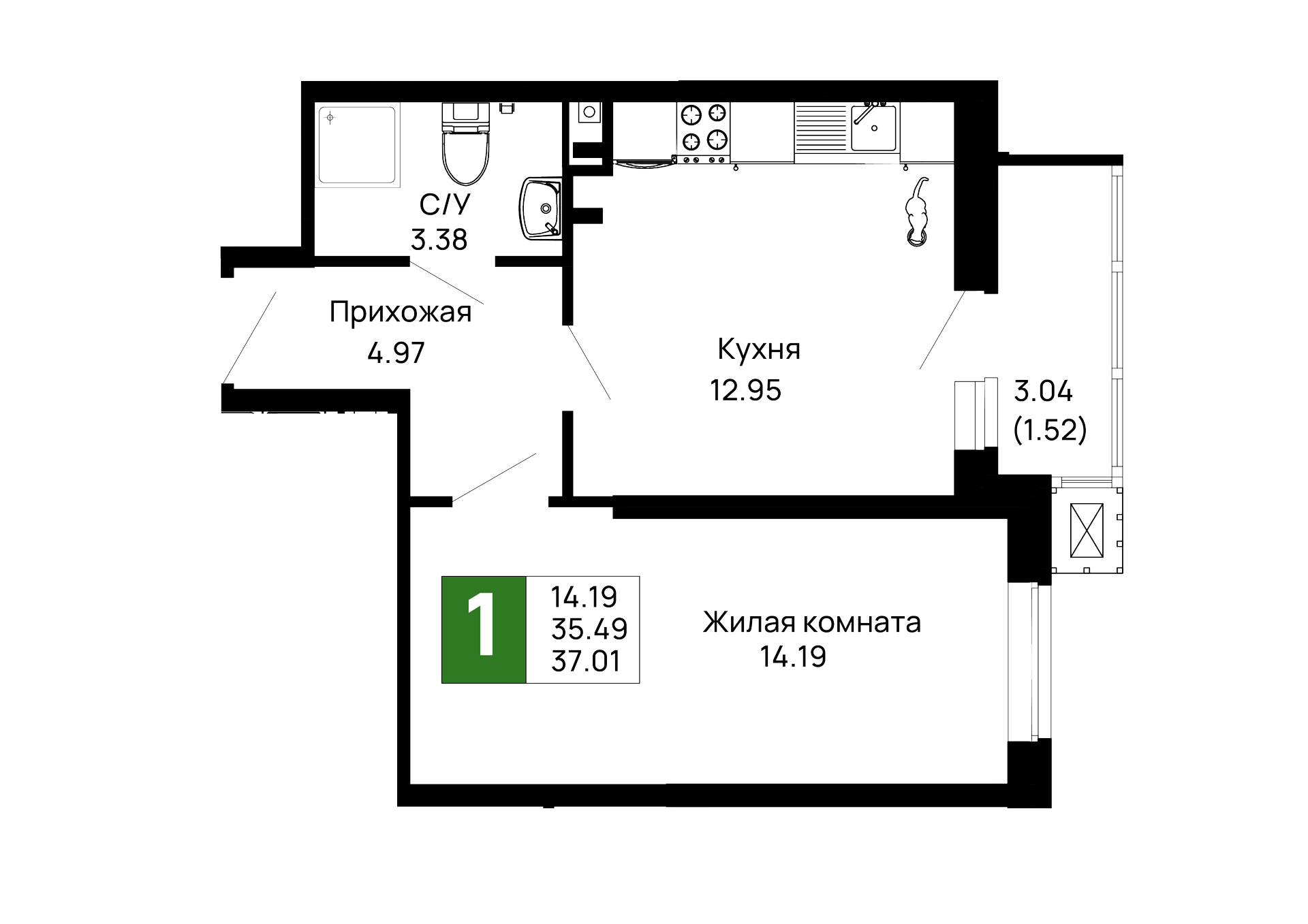 - Жилая площадь: 14.19 м²