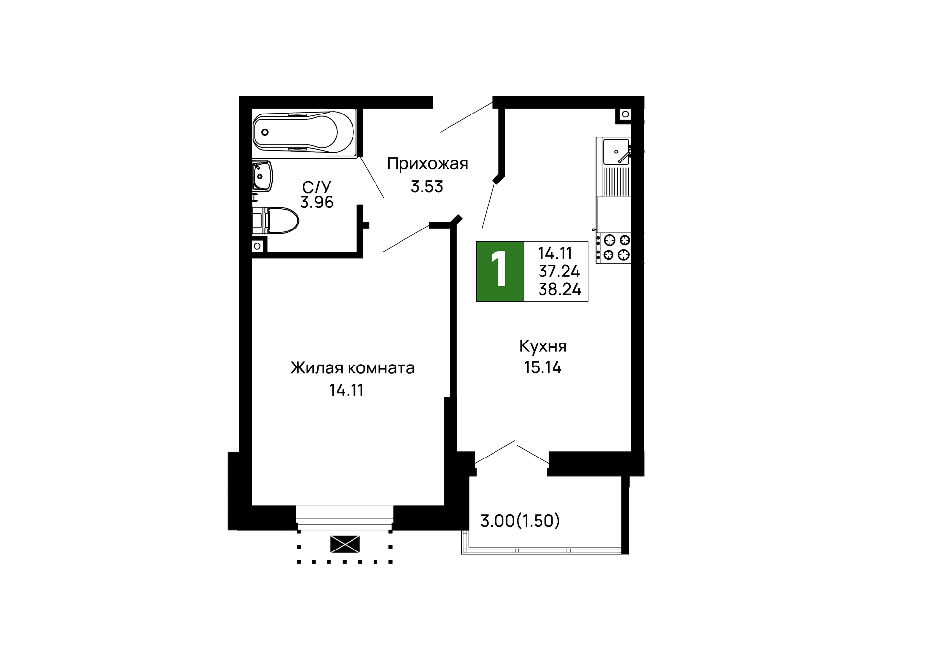- ✅ Кухня: 15.14 м² — эргономичное пространство.