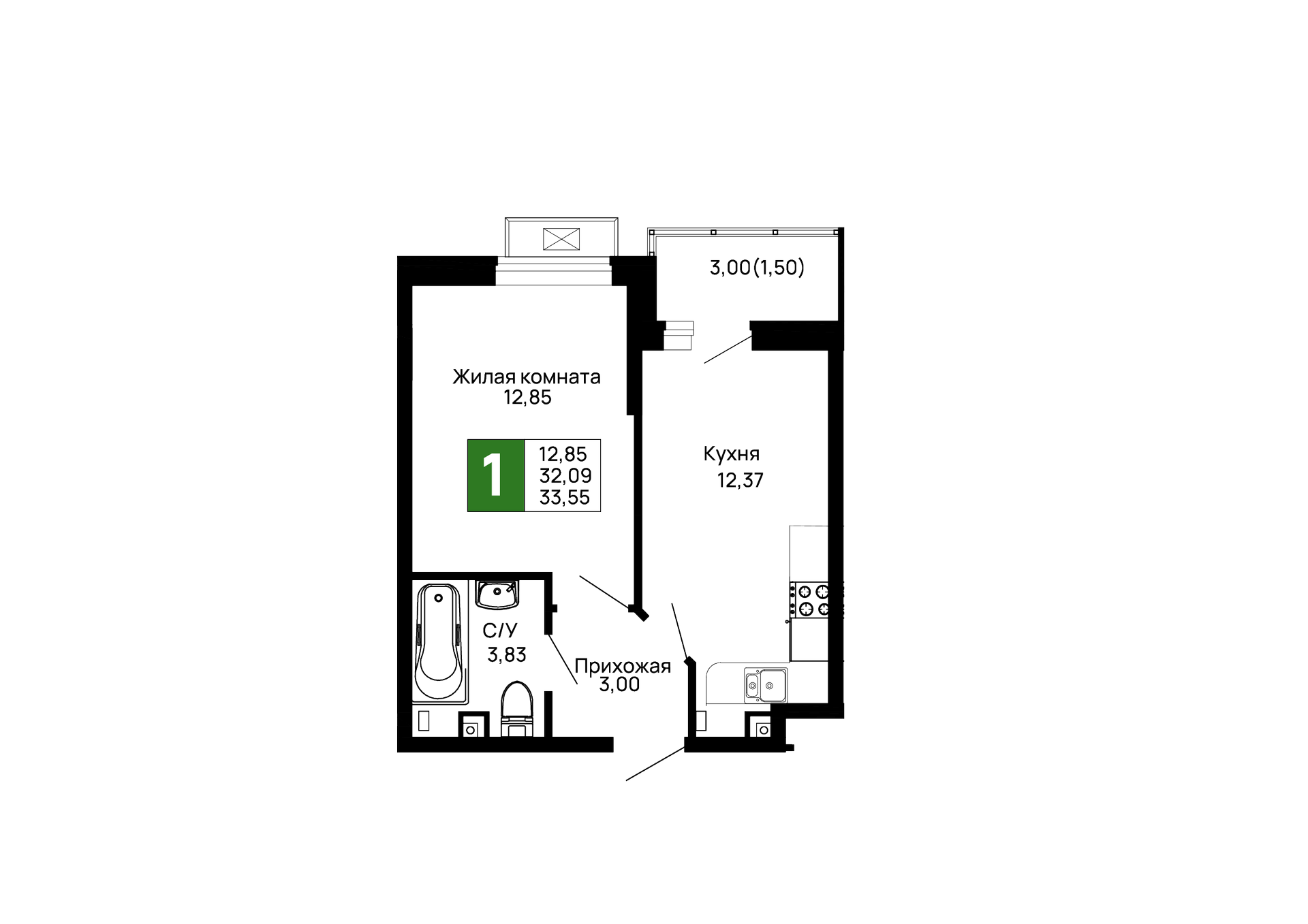 - ✅ Кухня: 12.37 м² — эргономичное пространство.