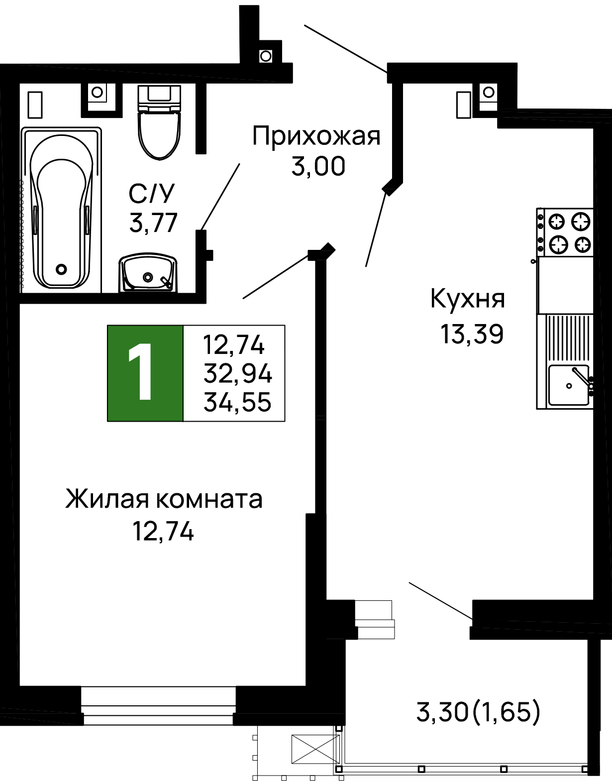 - Общая площадь: 34.55 м²