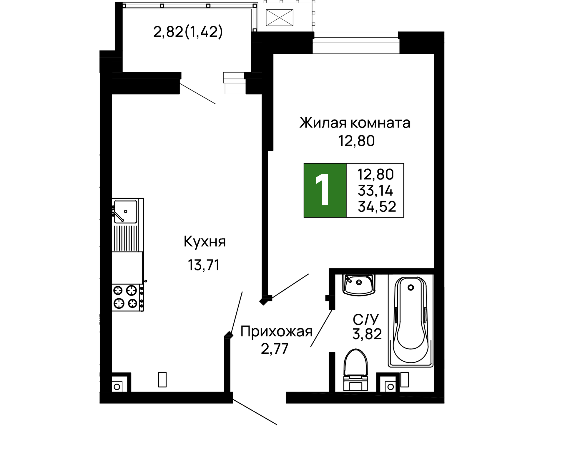 - ✅ Кухня: 13.71 м² — идеальна для семейных ужинов.