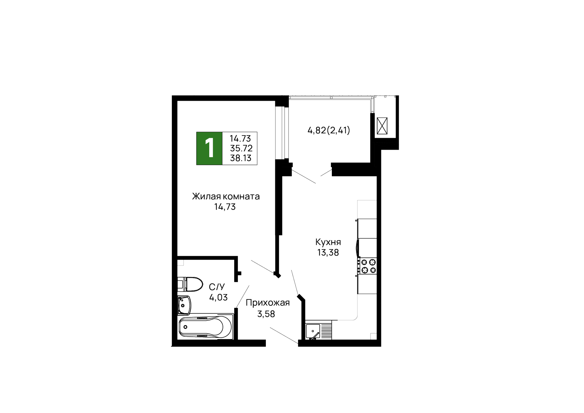 - ✅ Кухня: 13.38 м² — эргономичное пространство.