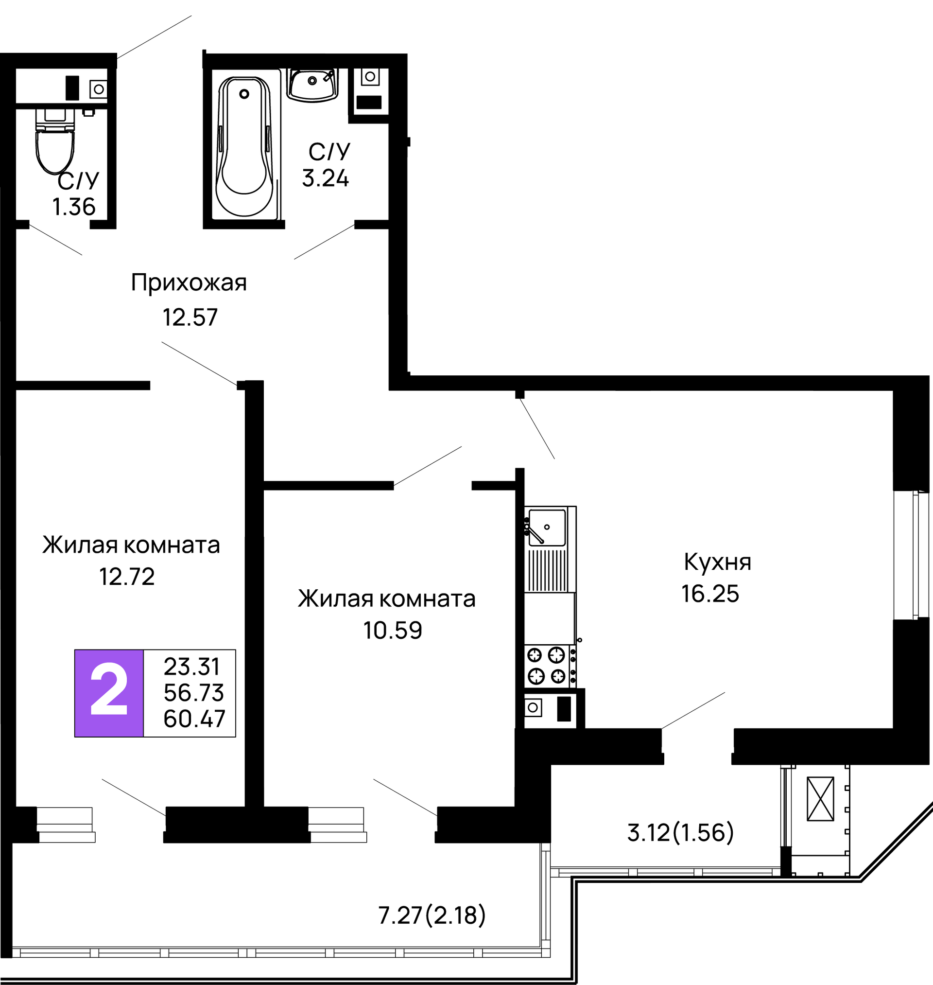 - Общая площадь: 60.47 м²