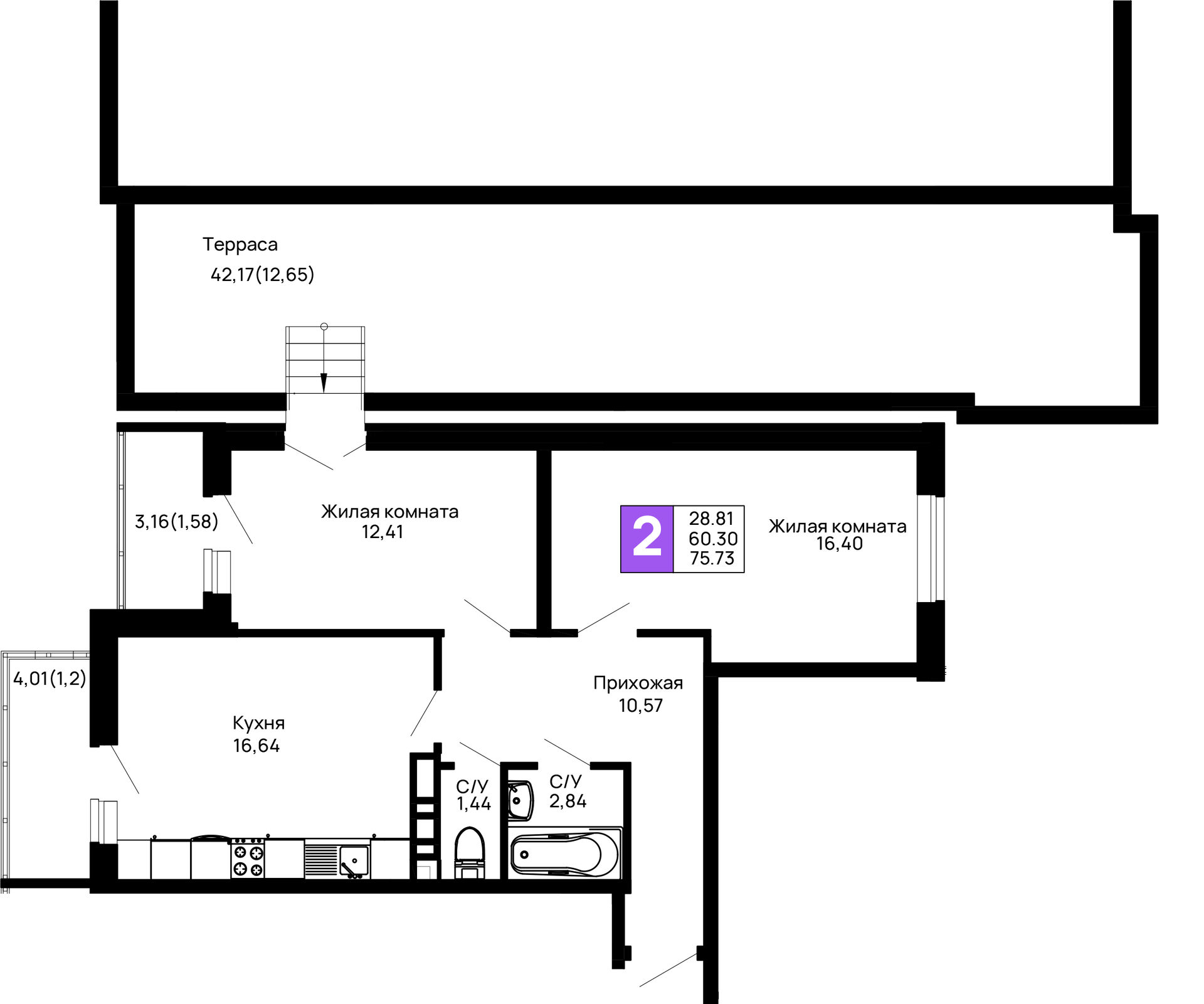 - Общая площадь: 75.73 м²