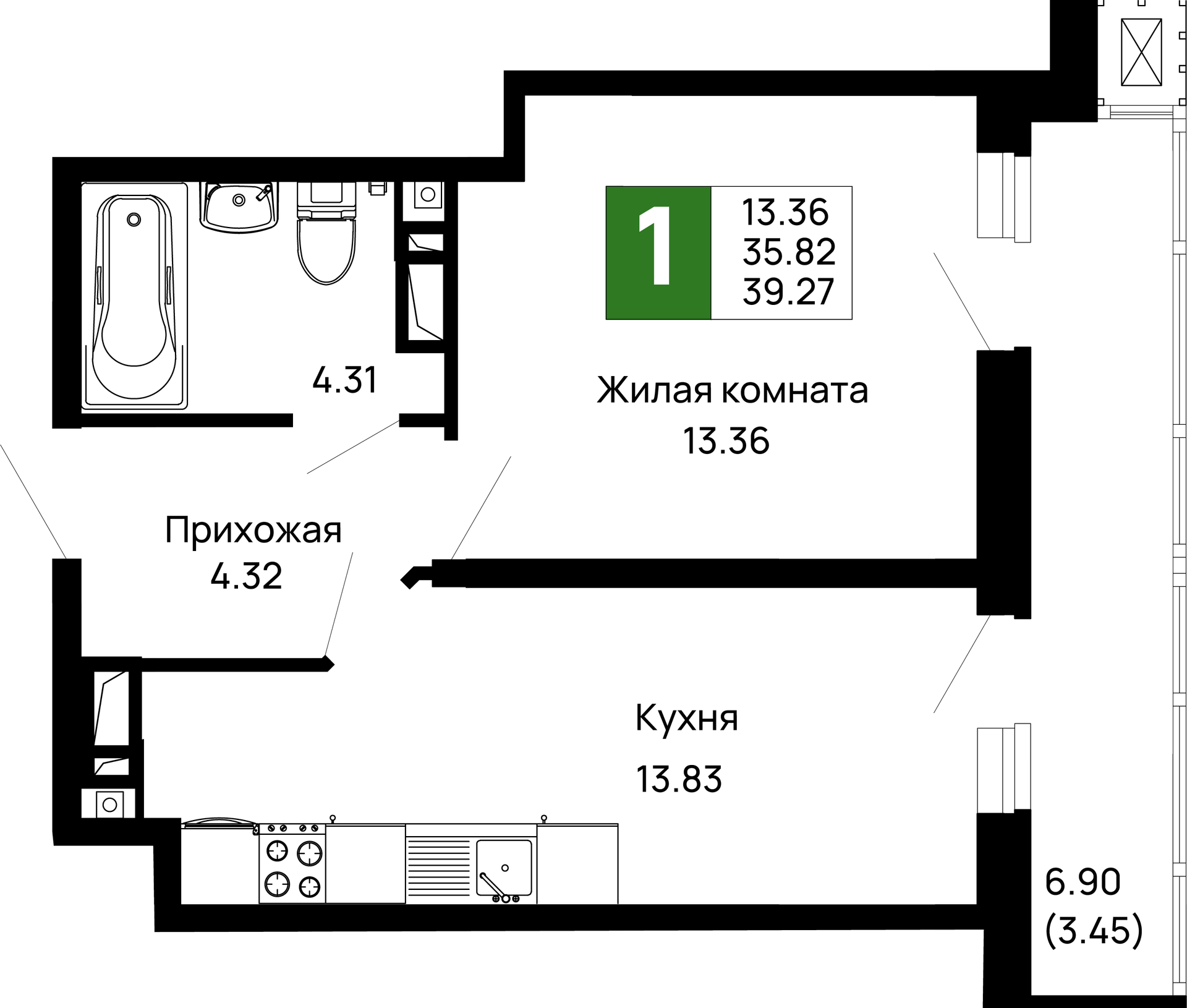 - ✅ Кухня: 13.83 м² — идеальна для семейных ужинов.