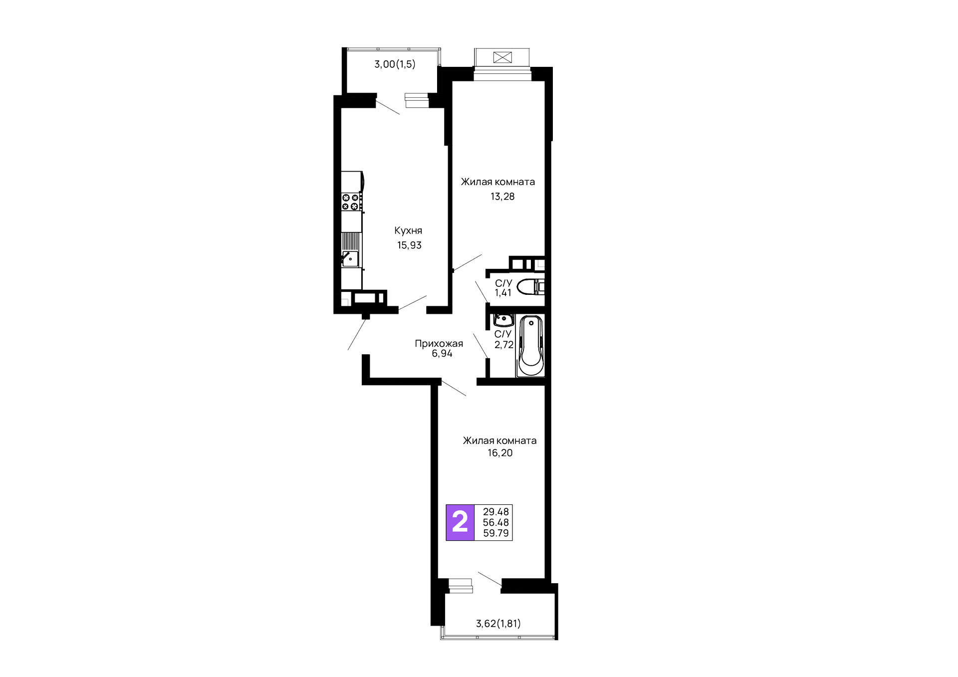 - Общая площадь: 59.79 м²