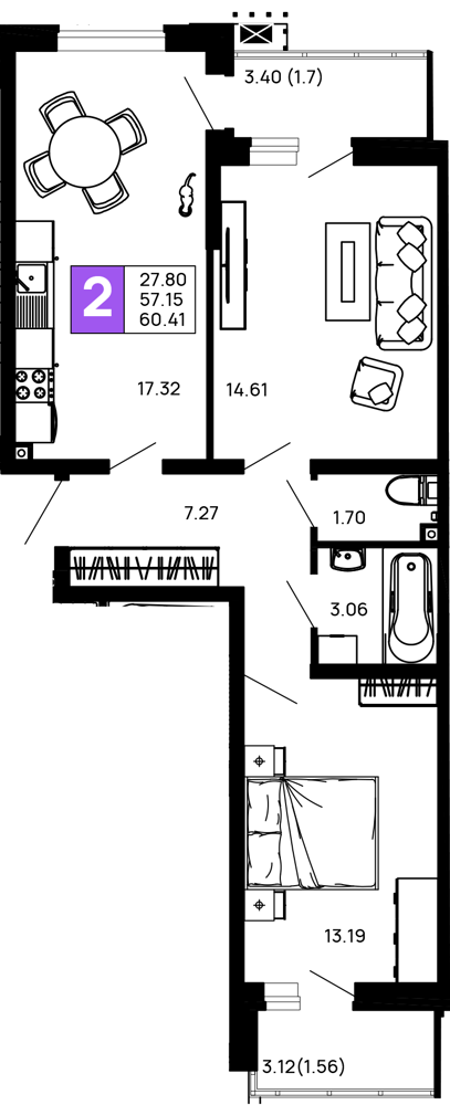 - ✅ Кухня: 17.32 м² — идеальна для семейных ужинов.