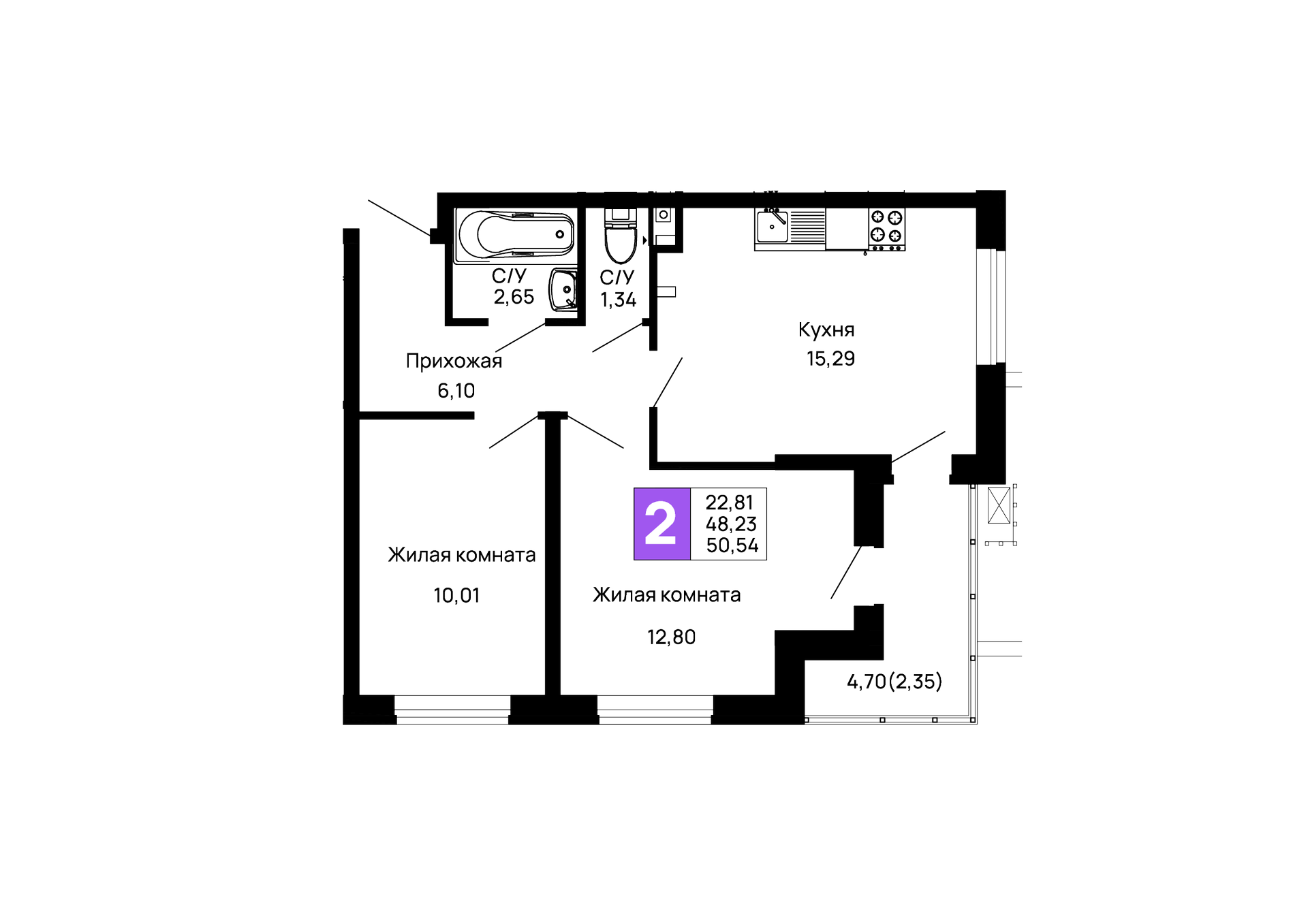- Общая площадь: 50.54 м²