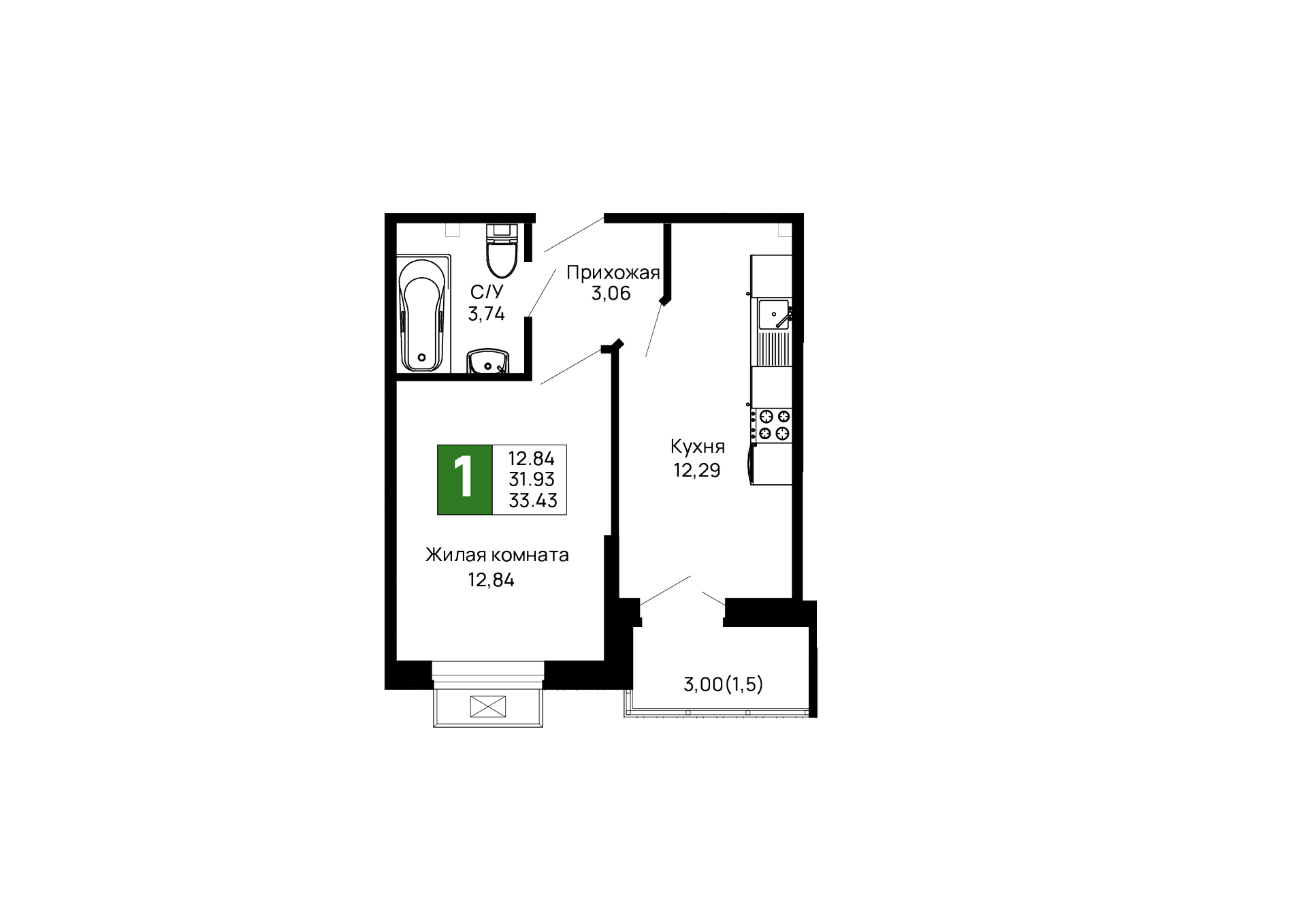 - Общая площадь: 33.43 м²