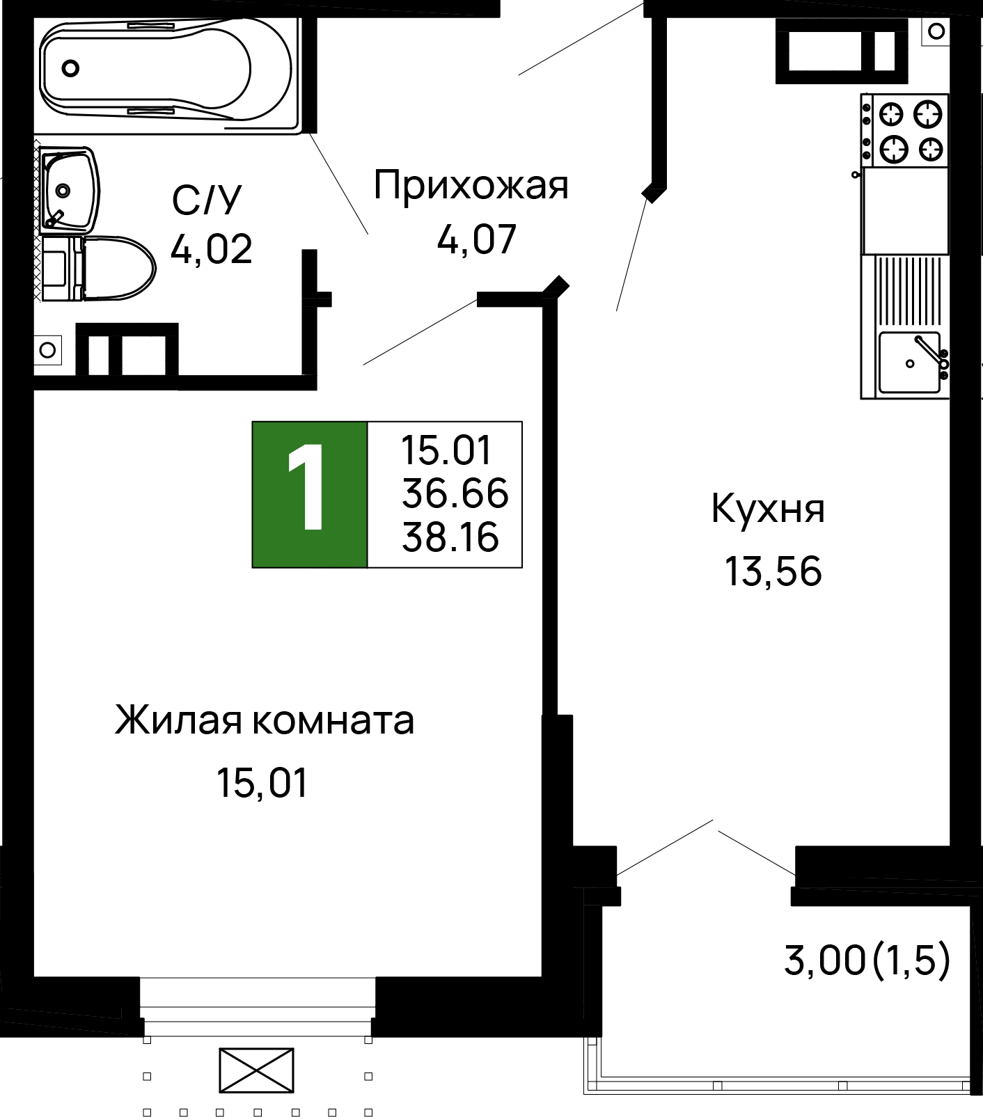 - ✅ Кухня: 13.56 м² — место для кулинарных шедевров.