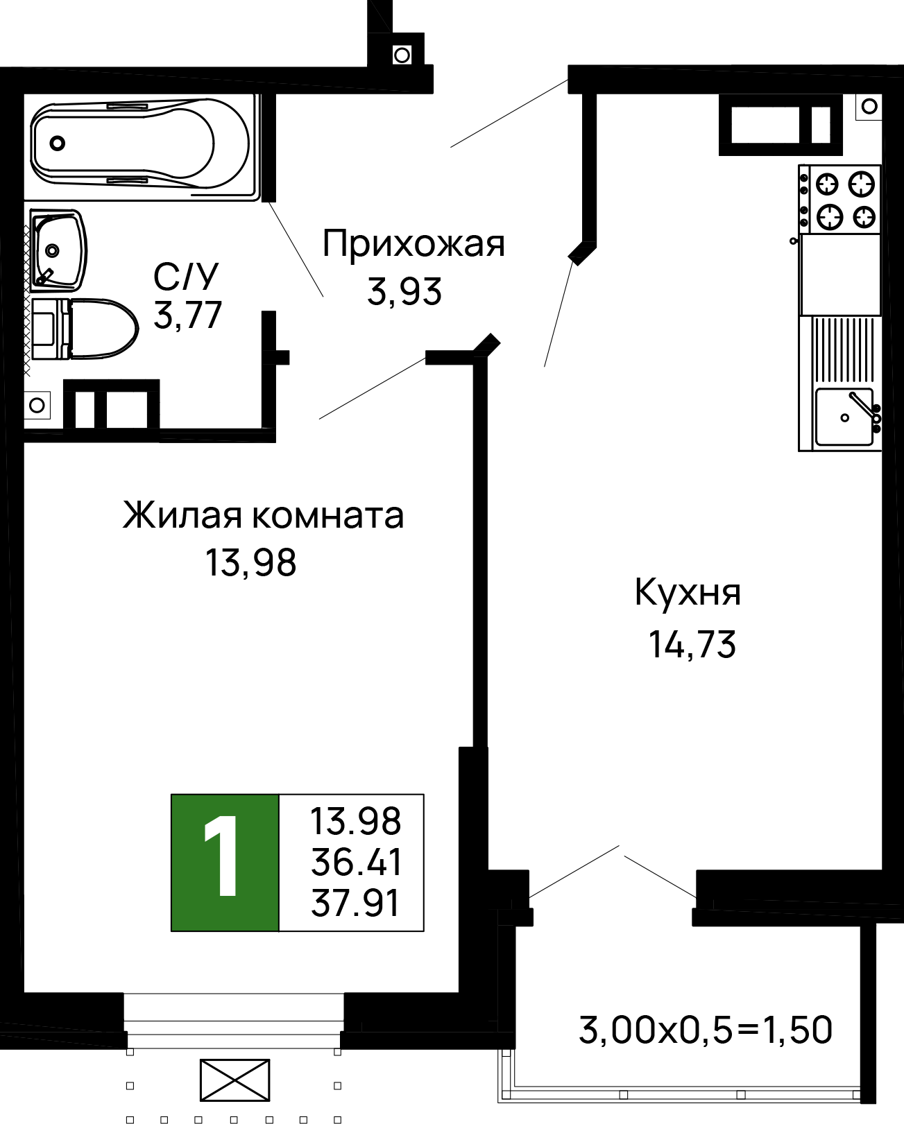 - Общая площадь: 37.91 м²