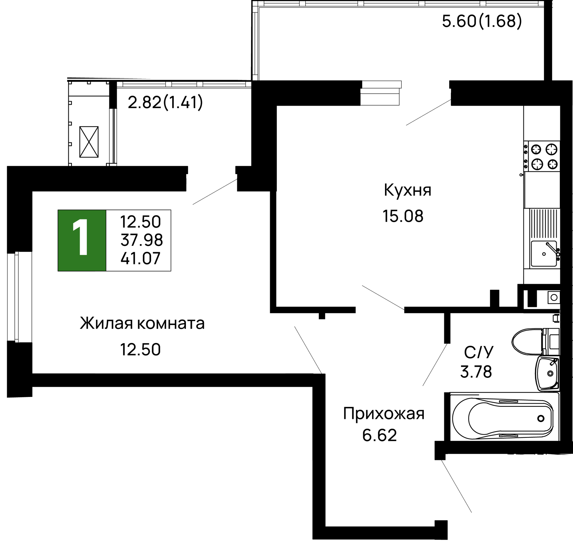 - Общая площадь: 41.07 м²