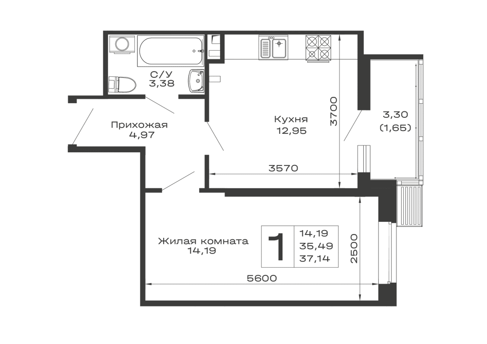 - Общая площадь: 37.14 м²
