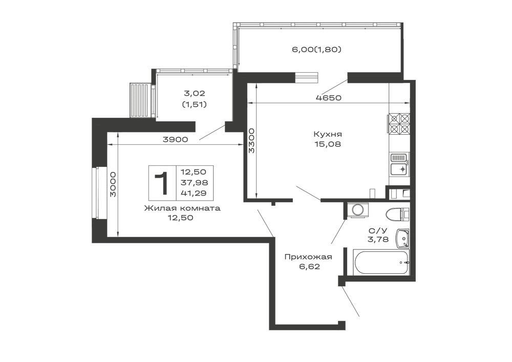 - Общая площадь: 41.29 м²