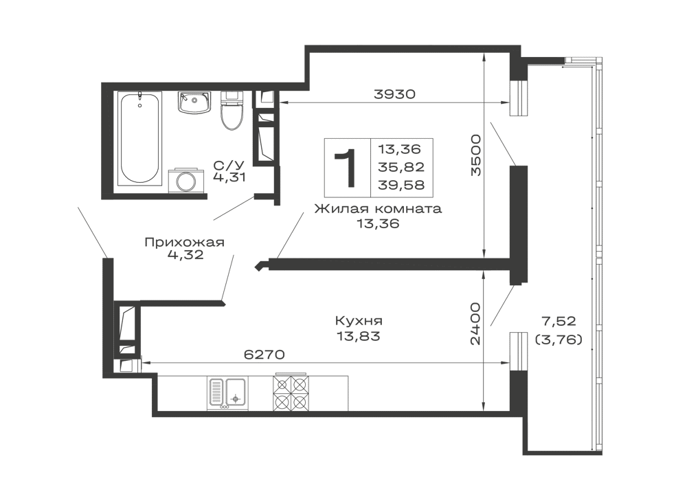 - Общая площадь: 39.58 м²