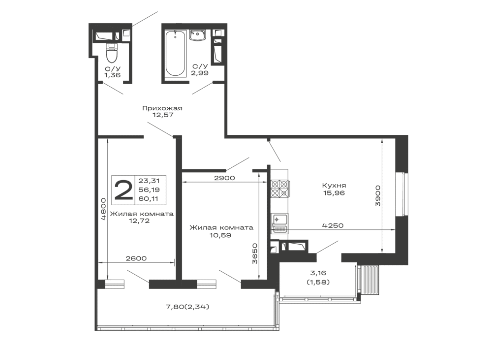 - ✅ Кухня: 15.96 м² — место для кулинарных шедевров.