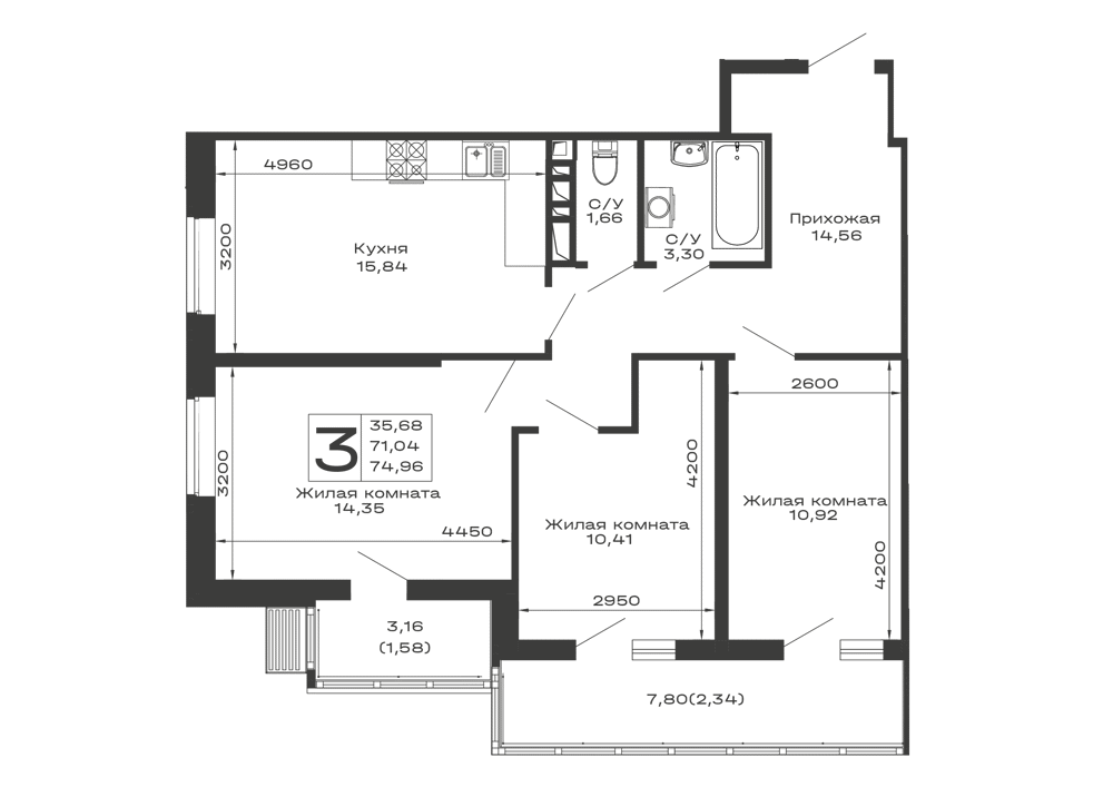 - Общая площадь: 74.96 м²