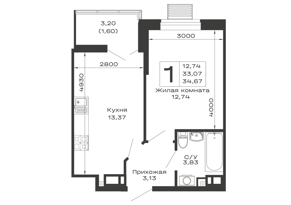 - Общая площадь: 34.67 м²