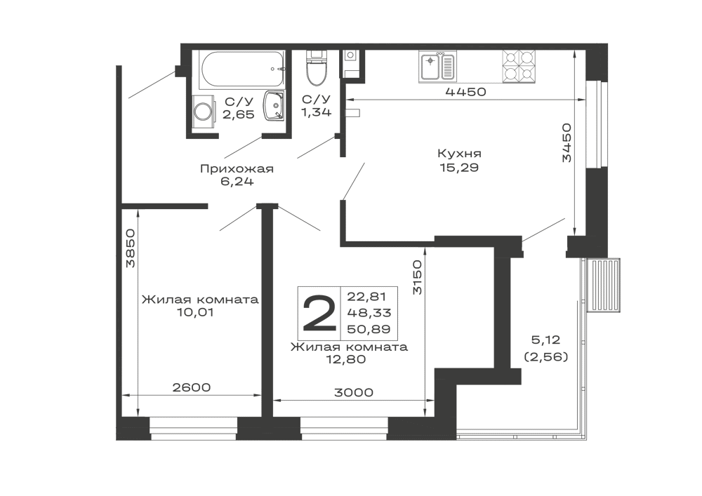 - Общая площадь: 50.89 м²