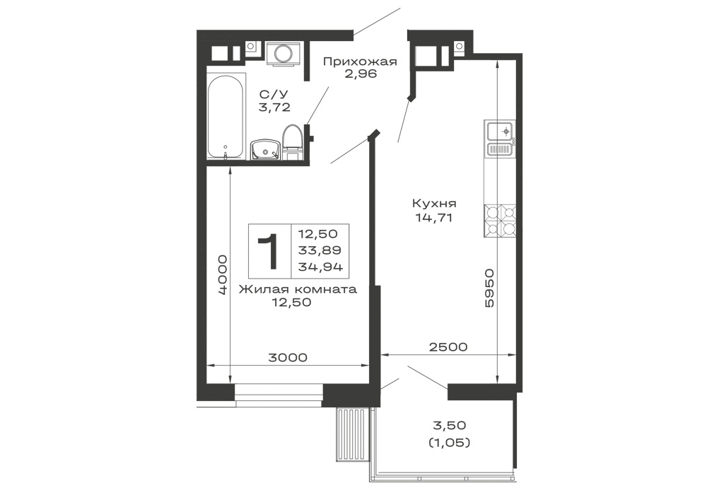 - Общая площадь: 34.94 м²