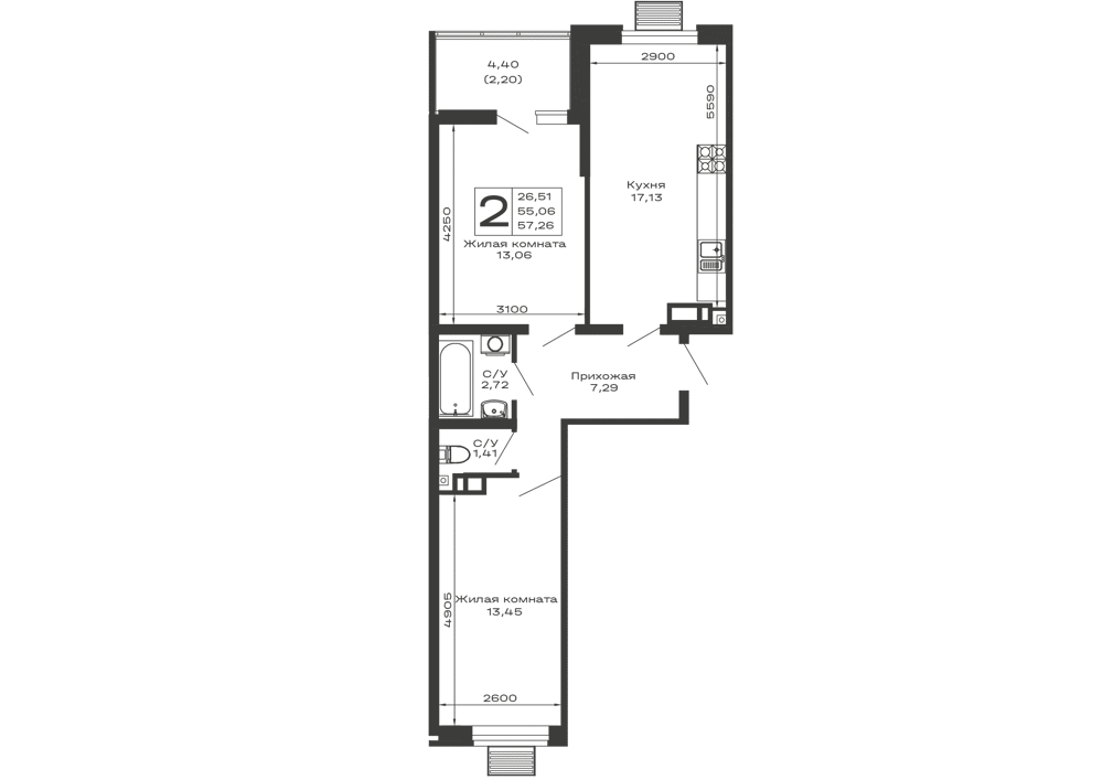 - ✅ Кухня: 17.13 м² — эргономичное пространство.