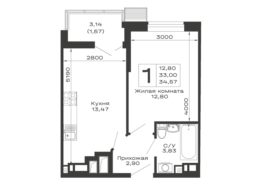 - Общая площадь: 34.57 м²