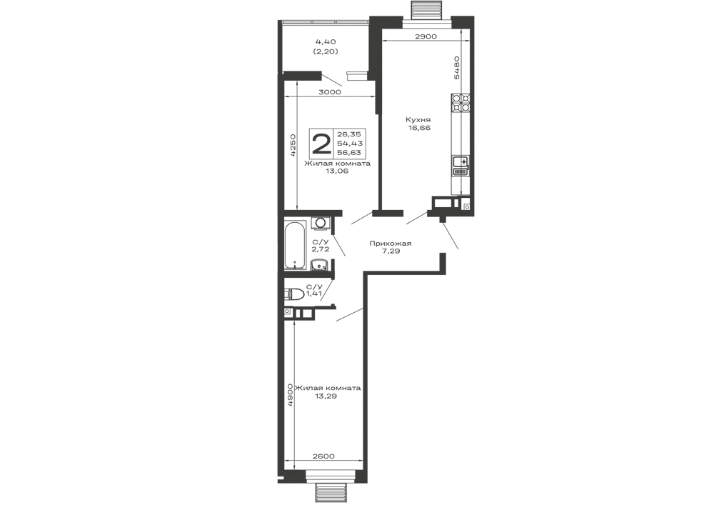 Планировка 1 комн. в ЖК Долина