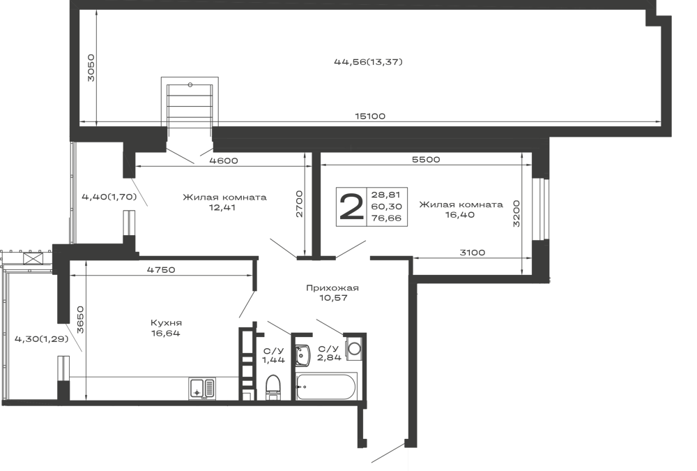 - Общая площадь: 76.66 м²
