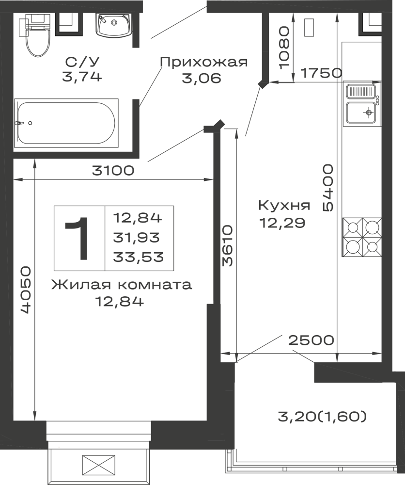 - Общая площадь: 33.53 м²
