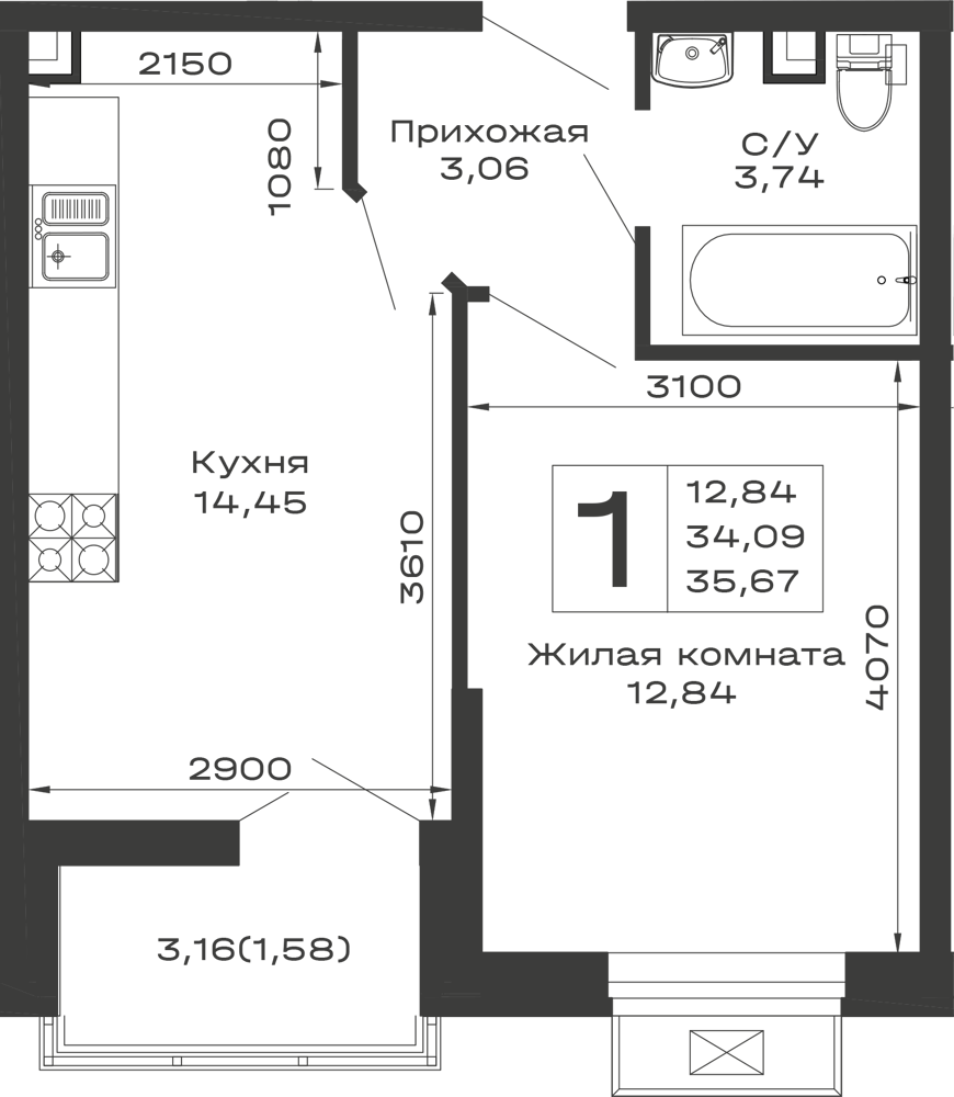 - Количество комнат: 1-комнатная квартира