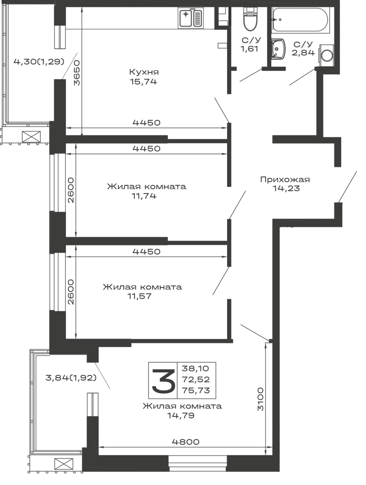 - ✅ Кухня: 15.74 м² — место для кулинарных шедевров.