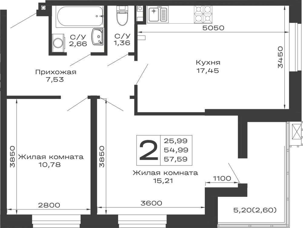 - Общая площадь: 57.59 м²