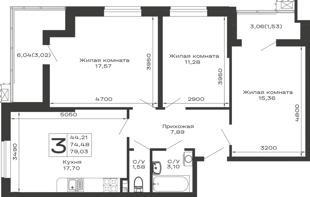 - ✅ Кухня: 17.7 м² — эргономичное пространство.
