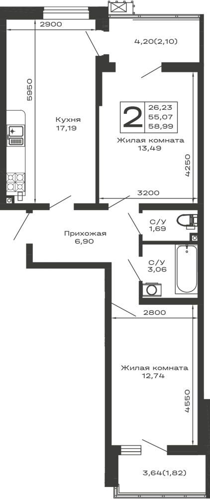 - ✅ Кухня: 17.19 м² — эргономичное пространство.