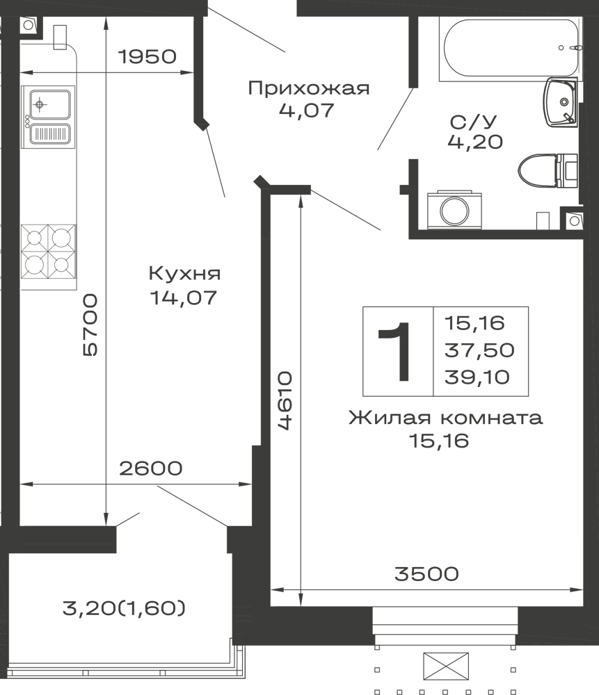 - ✅ Кухня: 14.07 м² — эргономичное пространство.