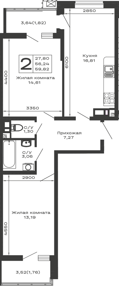 Планировка 1 комн. в ЖК Долина