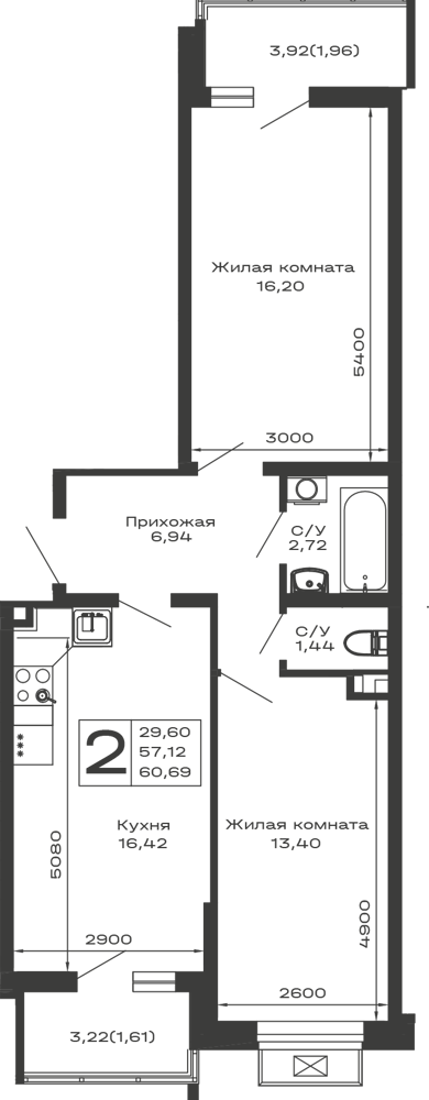 - Общая площадь: 60.69 м²