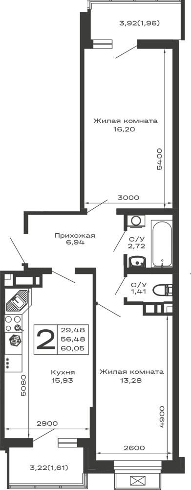 - Общая площадь: 60.05 м²