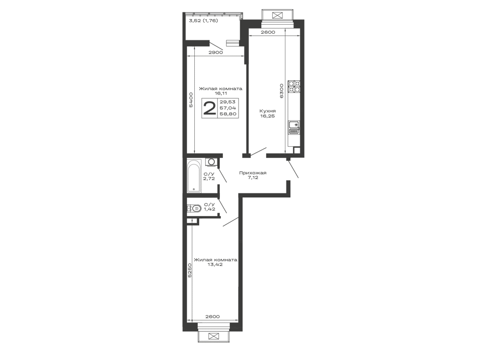 - Общая площадь: 58.8 м²