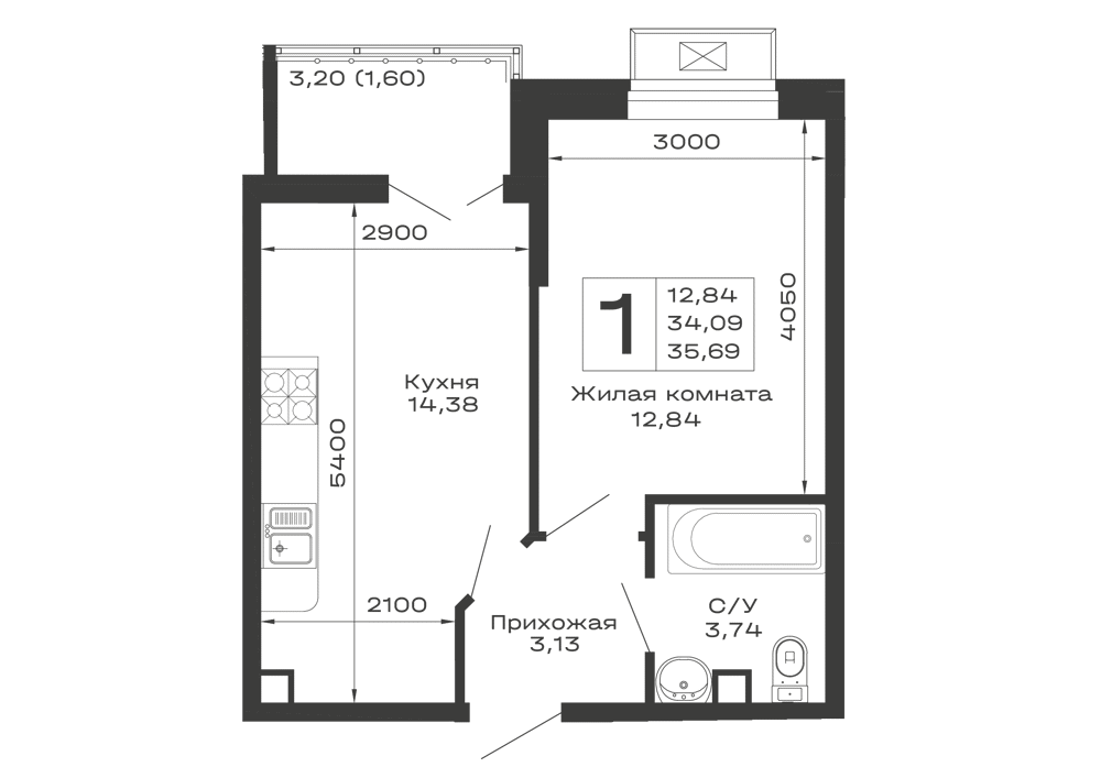 - Общая площадь: 35.69 м²