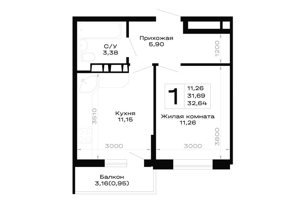 Планировка 1 комн. в Горные высоты